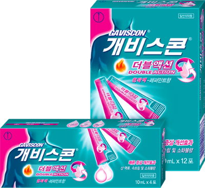 개비스콘 더블액션의 주 원료인 알긴산나트륨은 노르웨이의 해안을 따라 수확된 해초에서 유래되었습니다. 이 물질은 과민 상태를 유발하는 위 내용물(위산, 펩신 및 담즙 포함)에 보호막을 생성합니다. 이러한 물리적 방어막을 생성하여 위산이 위쪽으로 역류하는 것을 방지합니다. 또한, 제산제가 있어 산성을 중화시켜 속 쓰림의 이중 완화 효과가 있습니다. 따라서 개비스콘 더블액션은 탄산칼슘 및 제산제를 함유하여 3분 내 빠르게 작용하고 증상 완화 효과를 4시간까지 오래 유지해 줍니다.