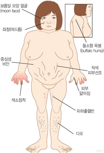 -비만: 얼굴, 목, 상체, 복부에 지방이 쌓여 과도한 콜라병 모양의 신체로 변할 수 있습니다.