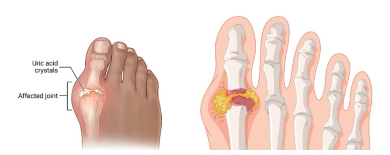 통풍은 혈액 내 요산 수치가 증가하여 요산염 결정이 관절의 연골, 힘줄, 주위 조직에 침착되어 생기는 질환입니다. 이렇게 요산염 결정이 지속해서 침착되어 나중에 관절의 염증을 일으키며 극심한 통증을 동반하게 됩니다. 이러한 통증은 재발성 발작을 일으키기도 하며 요산염 결정이 관절에 침착되면서 관절의 변형과 불구가 생기기도 합니다. 또한 다양한 신장질환을 유발하고 요산에 의해 신장에 돌이 생기는 콩팥돌증이 발병하기도 합니다.